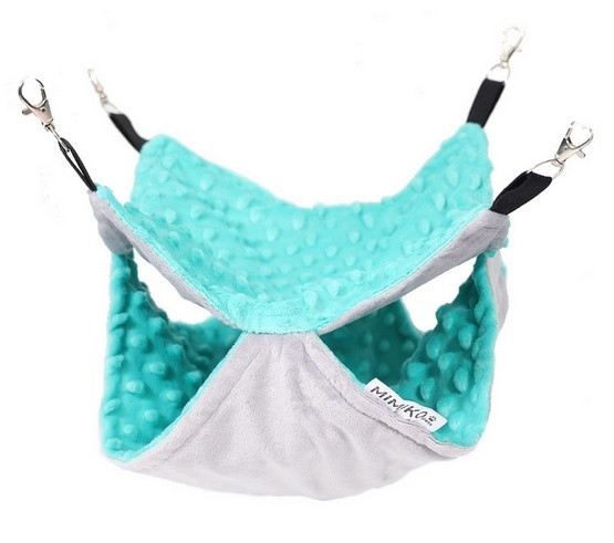 Hamak dla gryzonia dwupoziomowy z serii Candy na elastycznej taśmie z 4 karabińczykami. Hamak ten jest idealnym rozwiązaniem do wyższych klatek. Górne piętro to standardowy hamak, natomiast dolne tworzy przyjemną i ciasną norkę dla gryzonia. Dodatkowo można powiesić hamak stosunkowo nisko od podłogi i zapewnić trzecie, najniższe piętro w formie norki. Montaż karabińczykami jest bardzo łatwy i pozwala dowolnie manewrować hamakiem w klatce. Czarne taśmy przy karabińczykach amortyzują hamak, dzięki czemu mebelek dla gryzonia będzie bezpieczniejszy i trwalszy. Materiał od spodu to przyjemny w dotyku plusz, natomiast górna tkanina to błękitny plusz z mięciutkimi wypustkami.