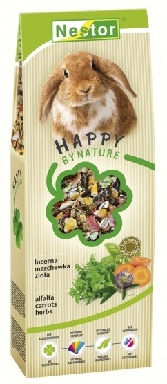 HAPPY BY NATURE – idealnie dopasowany i zbilansowany pokarm klasy PREMIUM z lucerną, marchewką i ziołami, został specjalnie przygotowany z myślą o królikach. Mieszanka pozbawiona sztucznych składników, barwników, konserwantów, starannie dobrana zgodnie z potrzebami i wymaganiami żywieniowymi królików, z siłą płynącą wprost z serca natury wspomaga ich zdrowie, kondycję i dobre samopoczucie.