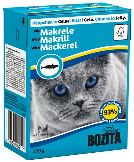 Kawałki w galaretce Bozita o smaku makreli to smaczna mokra karma dla kotów oparta na surowcach jakości. Duża zawartość mięsa i mała ilość tłuszczu oraz naturalnie zbilansowana zawartość witamin i składników mineralnych.
