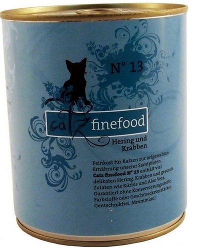 Specjał dla kotów – wartościowa karma dla naszych pupili. Catz finefood N°13 zawiera dużo delikatnego śledzia, krabów oraz zdrowe dodatki, jak dynia i aloes. Bez konserwantów, barwników i wzmacniaczy smaku. Nie zawiera GMO. Mmmmiau!