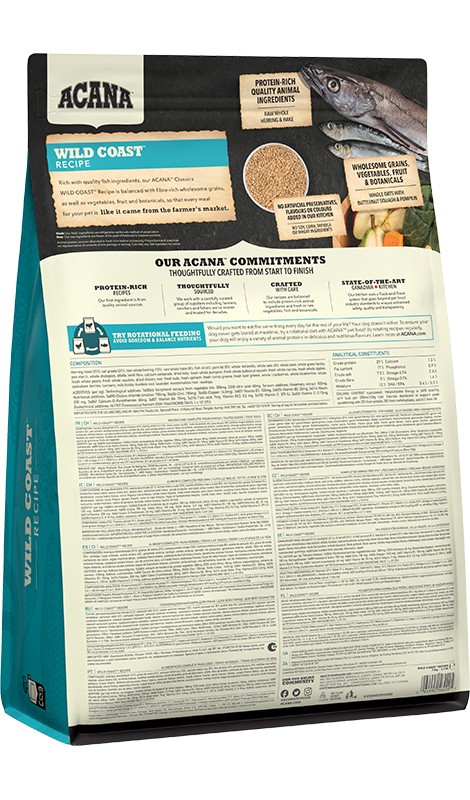 ACANA CLASSICS Wild Coast zawiera pełnowartościowe białko ryb: śledzia pacyficznego, flądrę strzałozębną oraz morszczuka srebrzystego. Składniki te dostarczane są do naszej kuchni ŚWIEŻE lub SUROWE w proporcjach WholePrey™.