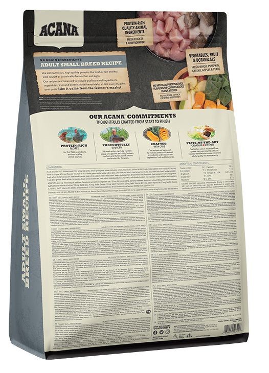 Psy małych ras mają takie same wymagania żywieniowe, jak psy duże. Oznacza to, że potrzebują diety bogatej w zróżnicowane składniki mięsne, niezbędne dla ich zdrowia. ACANA Adult Small Breed jest przepełniona kurczakiem i poławianą w naturalnym środowisku flądrą, a także odżywczymi jajami, dzięki czemu dostarcza wszystkiego, czego potrzebuje Twój pies małej rasy, aby pozostać szczęśliwym, zdrowym i silnym.