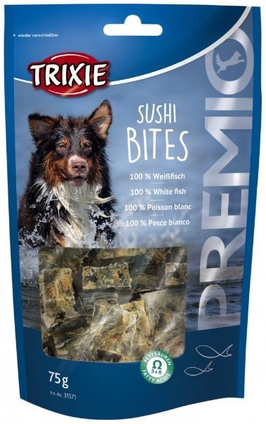 Zdrowy i smaczny przysmak dla psa Trixie Premio Sushi Bites Light, w 100% z białej ryby, z kwasami tłuszczowymi Omega-3 i Omega-6, bez środków konserwujących, w opakowaniu wielokrotnego zamykania.